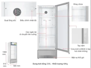 – 1 cửa tủ chất liệu kính trong suốt, chịu lực và cách nhiệt tốt, được phủ lớp cách nhiệt Low-E tăng hiệu quả bảo vệ thực phẩm bên trong nhờ tránh hấp thụ nhiệt từ bên ngoài, đồng thời giữ tủ không bị đọng sương trên mặt kính mất thẩm mỹ, giúp dễ dàng quan sát thực phẩm cất giữ bên trong.